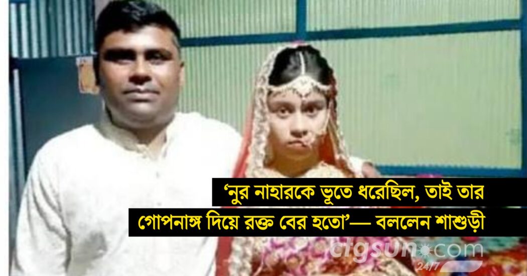 নুর নাহারের নানা লাল খান বলেন, মেয়েটি বিয়ের রাত থেকেই রক্তক্ষরণ হচ্ছে বলে জানিয়েছিল। এ জন্য নুর নাহারের শাশুড়ি তাকে গ্রাম্য কবিরাজের কাছ থেকে ওষুধ খাওয়াচ্ছিল। পরে রক্তক্ষরণ বেশি হলে তাকে হাসপাতালে ভর্তি করা হয়।