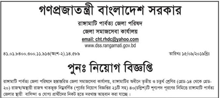 বুধবার, ১৮ সেপ্টেম্বর ২০১৯, ০৯:২৯ রাঙ্গামাটি পার্বত্য জেলা পরিষদ শূন্য পদে জনবল নিয়োগ দিবে। রাঙ্গামাটি জেলা পরিষদ ১২ টি পদে মোট ৪০ জনকে নিয়োগ দেবে। এই চাকরিতে রাঙ্গামাটি পার্বত্য জেলার স্থায়ী বাসিন্দারা শুধু আবেদন করতে পারবেন। আগ্রহ ও যোগ্যতা থাকলে