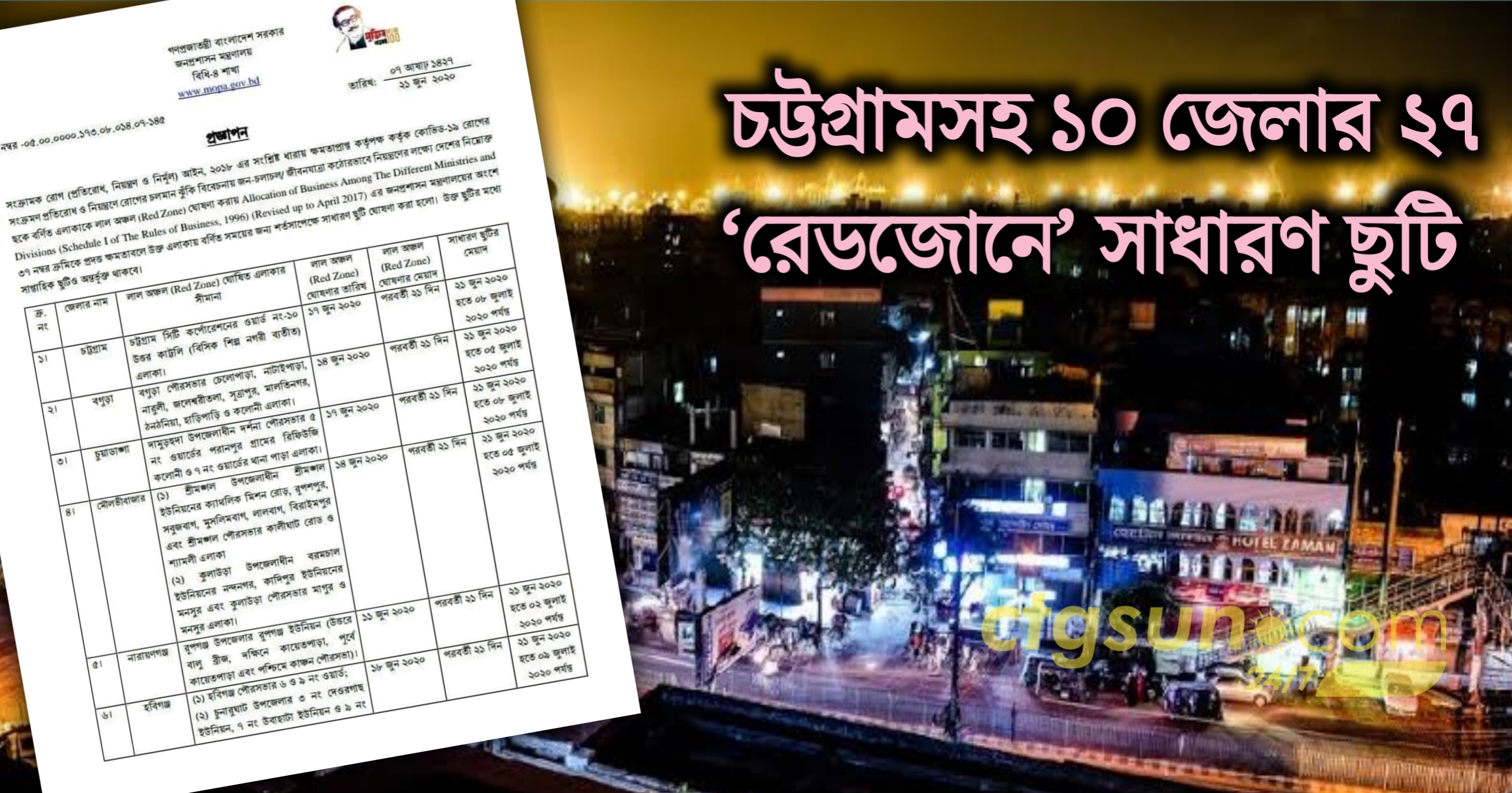 নিজস্ব প্রতিবেদক | আপডেট : ২২ জুন, ২০২০ সোমবার ০১:৪৫ পিএম করোনা সংক্রমণের অতি ঝুঁকিতে থাকায় ‘রেড জোন’ হিসেবে চিহ্নিত চট্টগ্রামসহ দেশের ১০ জেলার ২৭ এলাকায় সাধারণ ছুটি ঘোষণা করেছে সরকার। রবিবার (২১ জুন) মধ্যরাতে জনপ্রশাসন মন্ত্রণালয় সাধারণ ছুটি ঘোষণা
